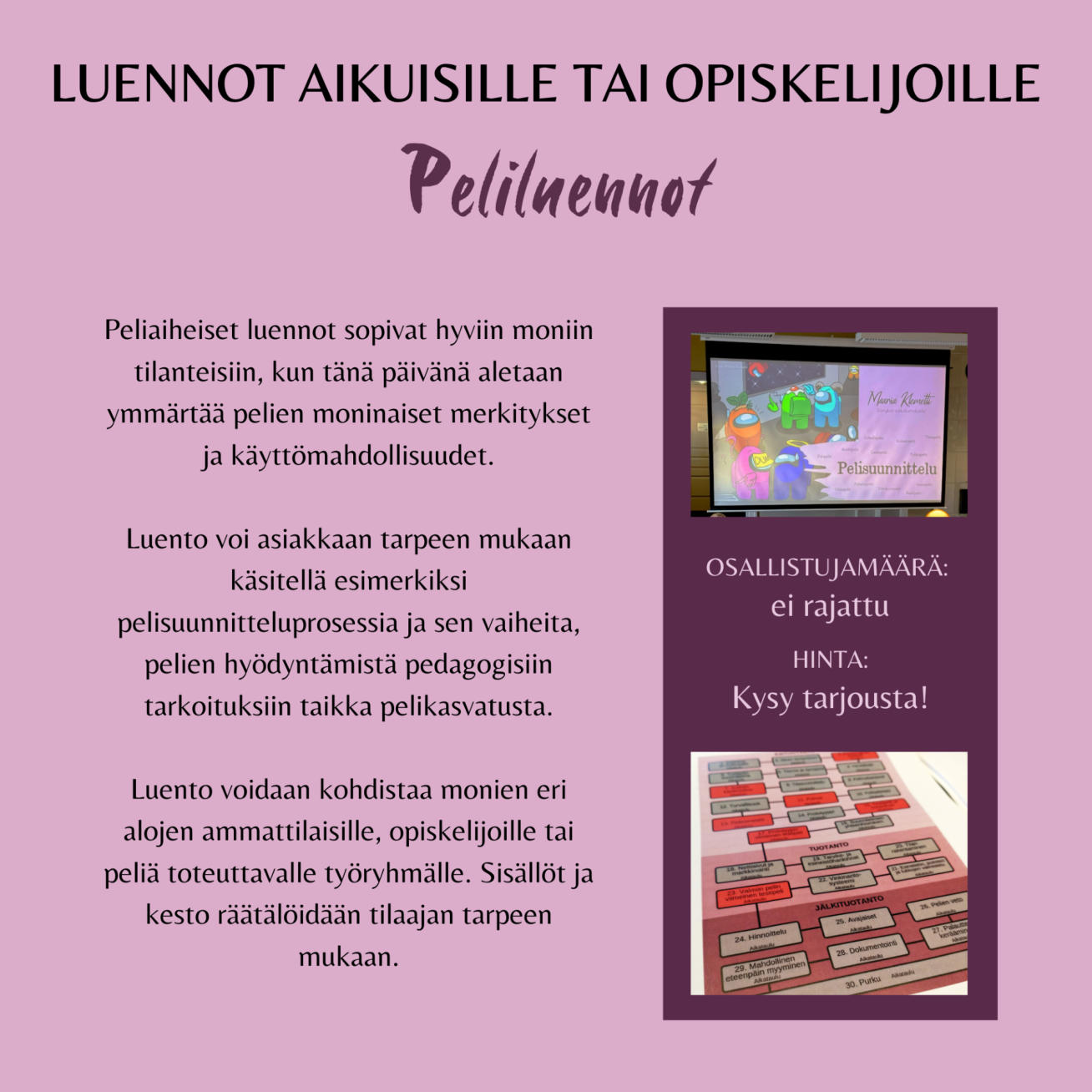 Luentoni ja koulutukseni perehdyttävät pelien ja niiden